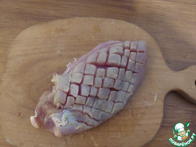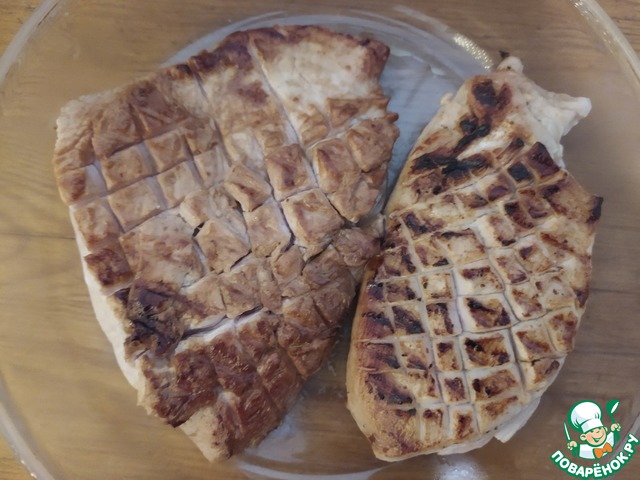 Промаринованное филе необходимо прожарить на раскаленной сковороде. Перед обжаркой делаем на филе небольшие надрезы.