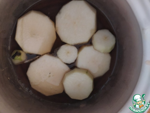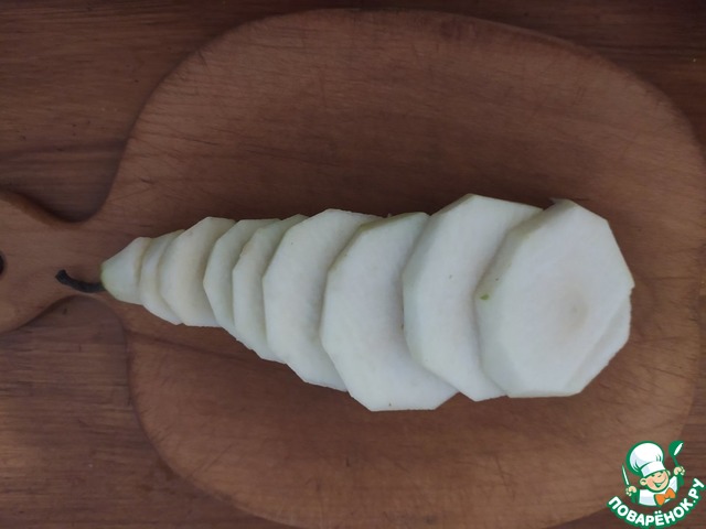 Приготовим глазированную грушу в белом вине. Грушу очистить от кожуры и порезать кружочками.