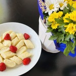 • Подаем вареники. У меня сегодня со сметанным кремом (сметана и сахарная пудра).