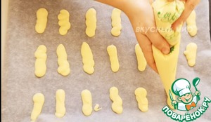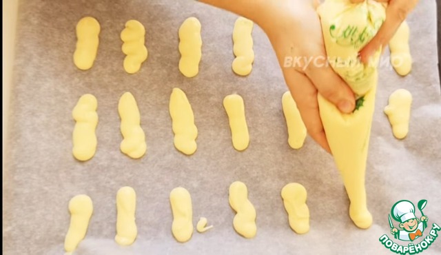 При помощи кондитерского мешка сформируйте продолговатые формы на противени. Выпекайте печенье 8-10 минут при 190 градусах.