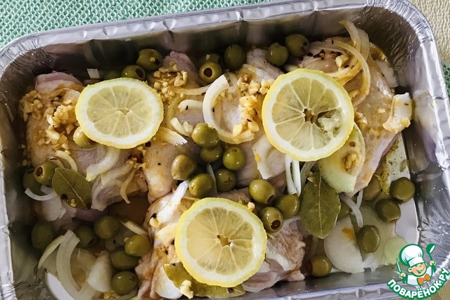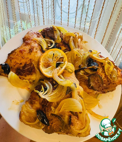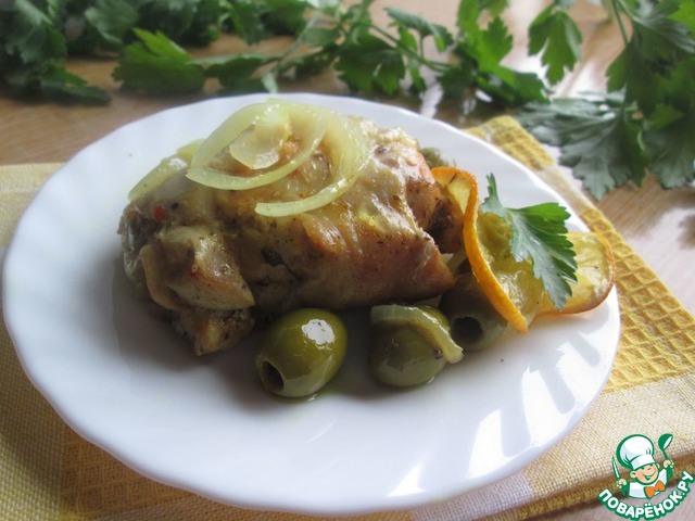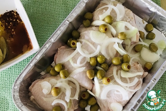 Разогреть духовку до 200"! Куски курицы кожицей вверх выложить в противень, сверху выложить лук порезанный полукольцами и оливки.