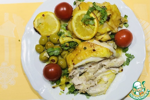 Залить курицу соусом, положить несколько долек лимона.
