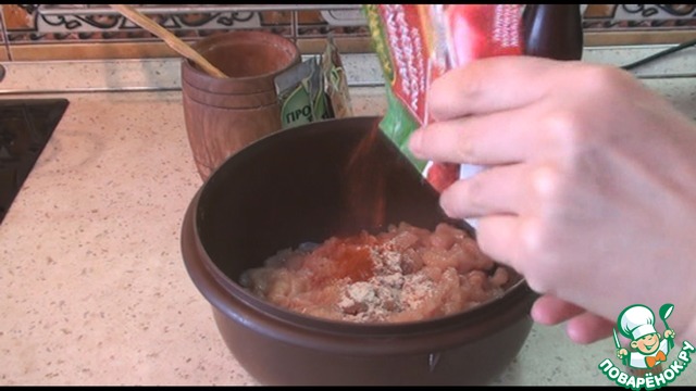 Для пирога нужно замариновать мясо заранее. Куриное филе режем на маленькие кусочки. Солим, перчим по вкусу, добавляем любимые специи. Хорошо перемешаем и оставляем минимум на три часа, желательно на ночь. Благодаря этому мясо быстро приготовится и будет сочным.