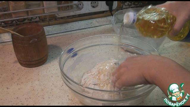 Постепенно добавляем просеянную муку, соль, замешиваем тесто. Когда вмешаем почти всю муку добавляем растительное масло.