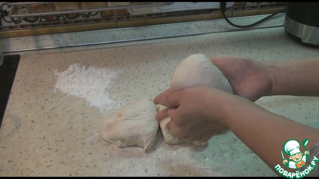 У меня поднималось тесто 40 минут, время зависит от температуры в помещении, может понадобится и больше. Достаём тесто, не обминаем его, делим на 4 части, округляем в колобочки, накрываем полотенцем и оставляем на 15 минут.