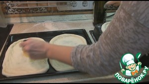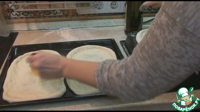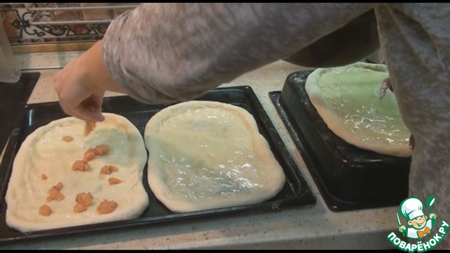 После этого берем по одному и руками формируем заготовку, разминаем пальцами посредине, а по бокам оставляем бортики. Выкладываем на противень, у нас получается один пирог на половину противня.
