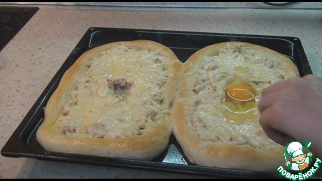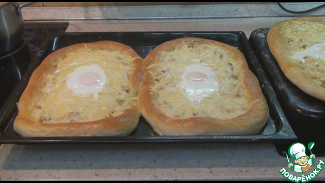Если будете готовить с яйцом, то через 7-10 минут достаньте пироги, сделайте небольшое углубление и разбейте яйцо. Запекайте буквально 3-4 минуты, я немного передержала и у меня желток схватился.