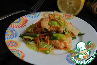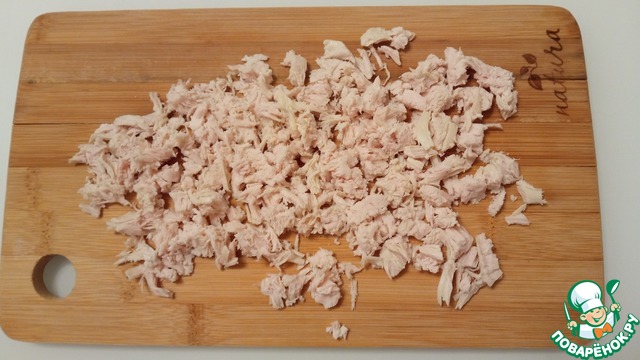 Куриное филе режем произвольно на небольшие кусочки. Отправляем в салатник.