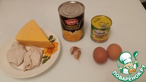 Подготовим все наши ингредиенты. Куриное филе и яйца предварительно отварить.