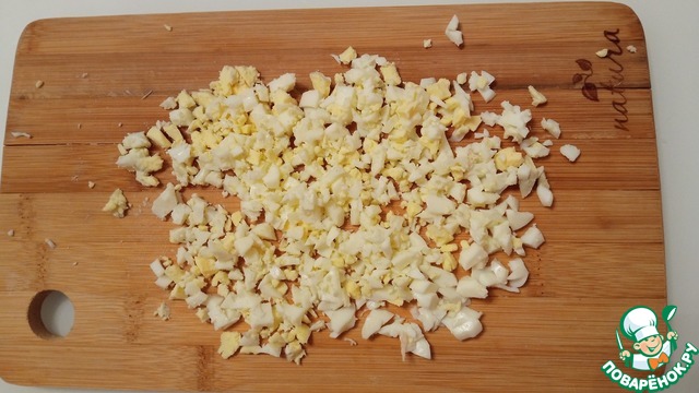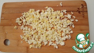 Яйца режем кубиками среднего размера. Сыр трем на крупной терке. Все добавляем в салатник.