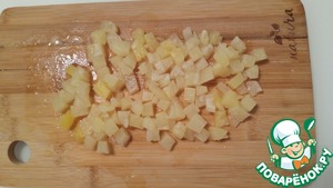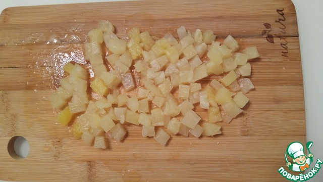 Ананасы режем маленькими кубиками. У меня ананасы были уже кусочками, но я их всё равно немного измельчила. Ушло чуть больше половины банки.