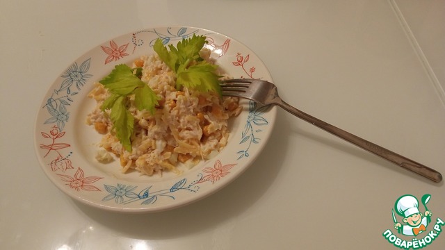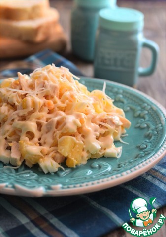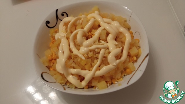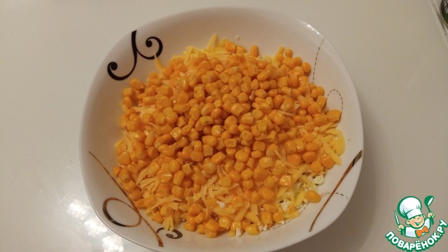 Кукурузу добавляем сразу в салатник, предварительно слив воду.