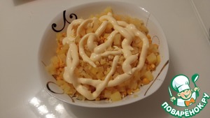Чеснок пропускаем через пресс. Солим по вкусу и заправляем майонезом.