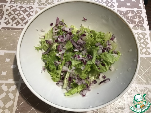 • Листья салата произвольно рвем руками и укладываем на дно салатника