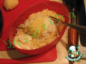 Смешиваем тертые на мелкой терочке яйцо, сыр, чеснок и заправляем майонезом, смазываем весь салат полученной массой