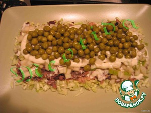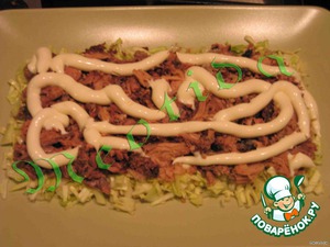 • Теперь выкладываем слой тунца (без жидкости) и тоже немного промазываем майонезом
