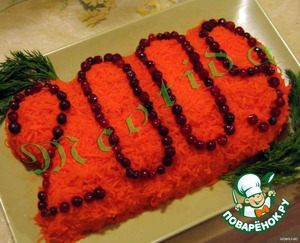 Теперь посыпаем тертой на мелкой терочке морковочкой, формируем края в виде циферок, сверху делаем надпись клюковкой.. немного свежего укропчика по краям и...