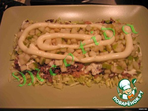 • Теперь слой груши, порезанной мелкими кубиками и тоже немного майонеза