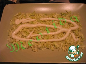 выкладываем слоем на тарелку и слегка смазываем майонезом -