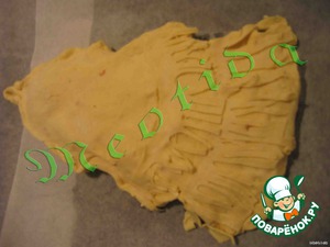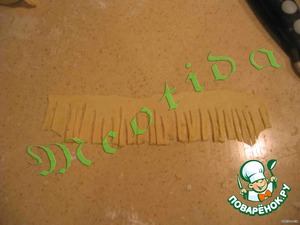 из оставшегося кусочка теста раскатываем тонкие полоски и надрезаем ножом, чтобы получилась бахрома
