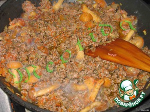 теперь выкладываем фарш, грибочки и постоянно мешаем, разбивая комочки, посыпаем специями, измельченным имбирем, солью, перчиком и жарим до готовности, пока вся жидкость не выпарится