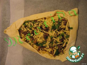 на тесто выкладываем начинку, все хорошенько посыпаем сыром