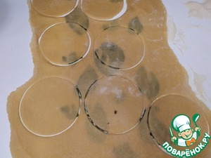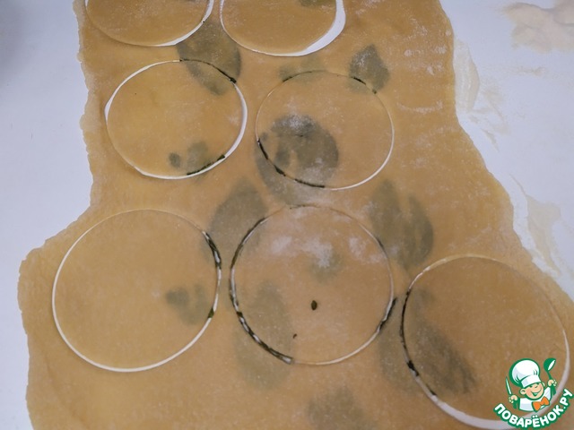 Края кружка смочить водой, сверху положить второй кружок, края прижать пальцами. Затем пройтись по ним вилкой.