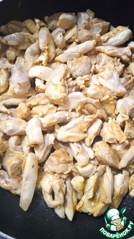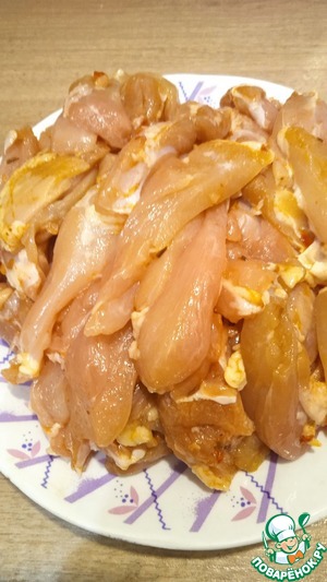 Куриное филе нарезать брусочками. Я взяла филе бедра, оно сочнее, можно и грудку, кому как нравится. Мясо я замариновала заранее в специях "для курицы".