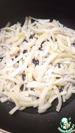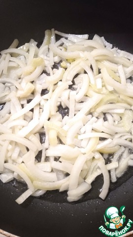 Луковицу нарезать перьями. Лук лучше взять больше среднего размера. Обжарить на разогретом масле 5 минут. Переложить в отдельную посуду.