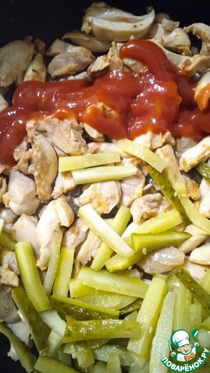 Огурцы нарезаем соломкой, добавляем к мясу, добавляем кетчуп.