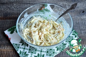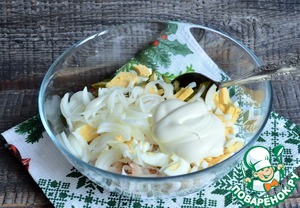 С лука слить маринад, отцедить, добавить в салатник лук и майонез.