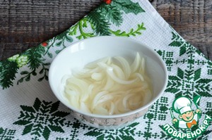 Лук нарезать перьями, залить уксусом и рассолом, отставить. -