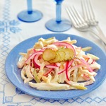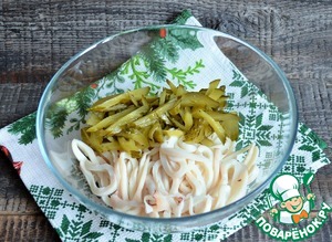 Нарезать тонкой соломкой кальмары и маринованные огурцы, сложить в салатник.