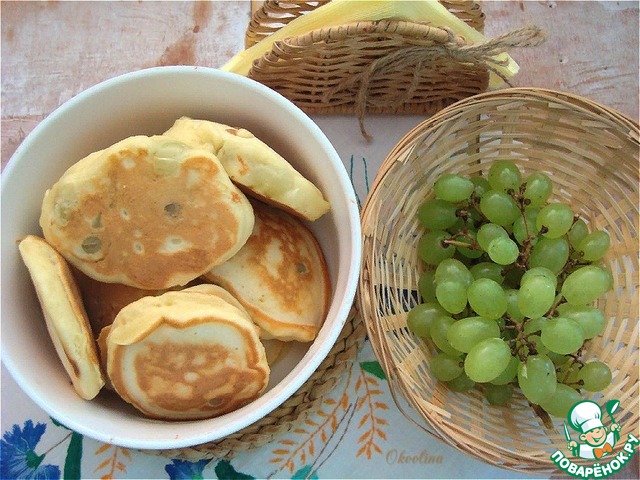 Добавила сахар, ванилин, соль и яйцо. Всё соединила венчиком. Просеяла муку и соединила со смесью. Ягоды от винограда взяла мелкие. Виноград лучше брать без косточек. Тесто перемешала, выложила в него виноград. Можно выпекать оладьи.