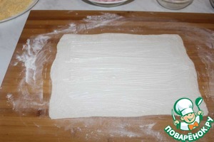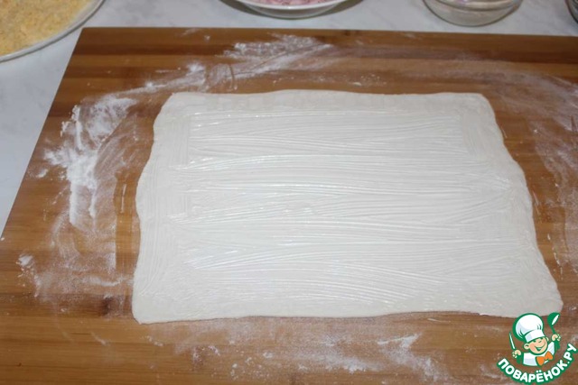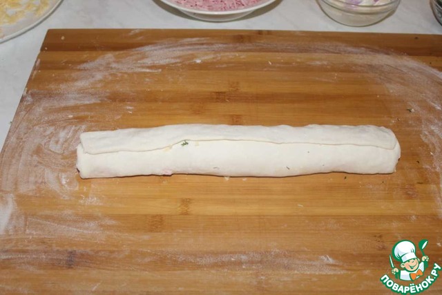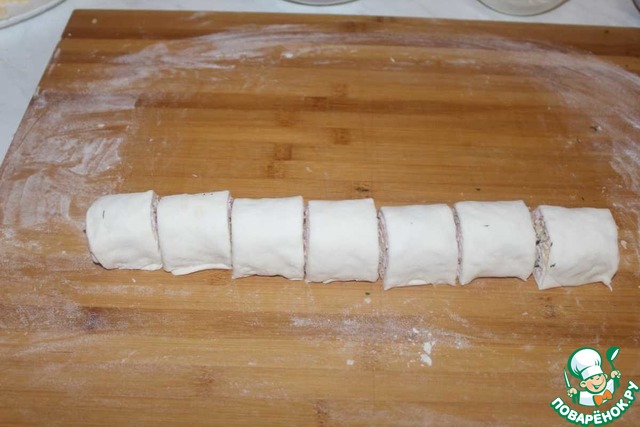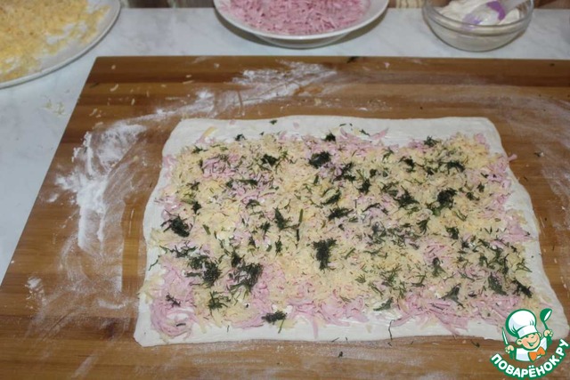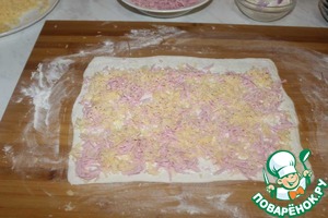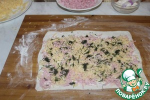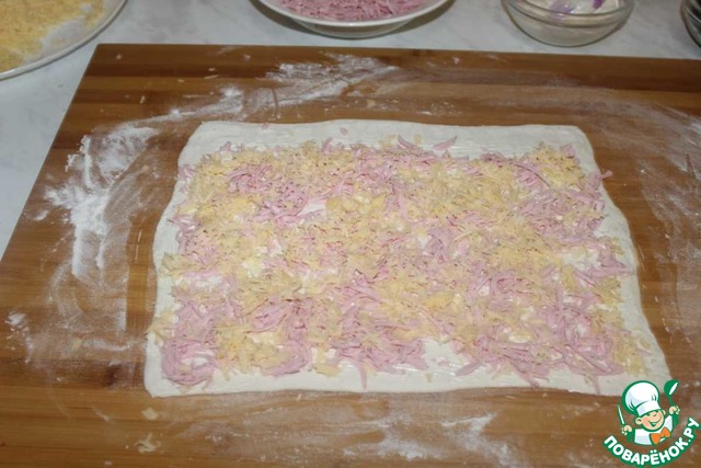 Кто мешает каждый пласт теста сделать со своей оригинальной начинкой (колбаса разная, бекон, грибы, фарш, да все, что придумается), а на выходе получить ассорти-блюдо на любой вкус!