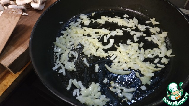 Для соуса лук очистить и мелко нарезать. Шампиньоны разрезать на половинки или на четвертинки. Растопить в сковороде 20 г сливочного масла и слегка подрумянить лук.