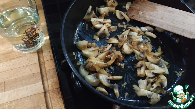 Добавить шампиньоны, влить оливковое масло и жарить, помешивая 5 минут.