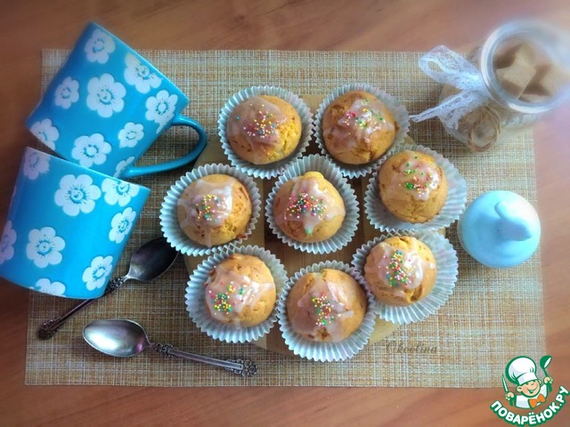 Покрываем кексы глазурью. Я посыплю их ещё кондитерской посыпкой. Это не обязательно. Ароматные и лимонные кексы порадуют вас, тыква в них почти не чувствуется.