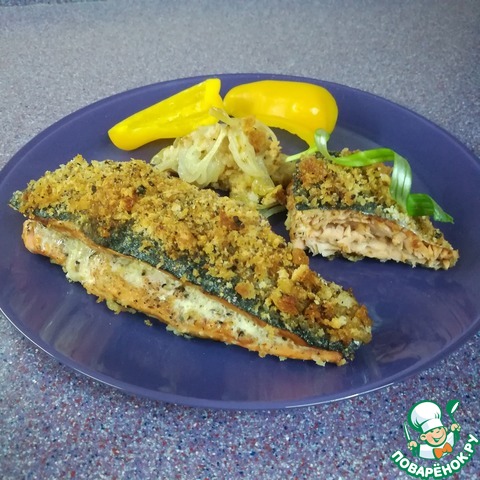 Накрыть вторым филе, сверху соль, перец, сухари. Полить оливковым маслом, отправить в разогретую духовку.