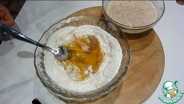 • В муку добавляем пюре, соль, корицу, желток и растопленное сливочное масло. Затем добавляем поднявшиеся дрожжи.