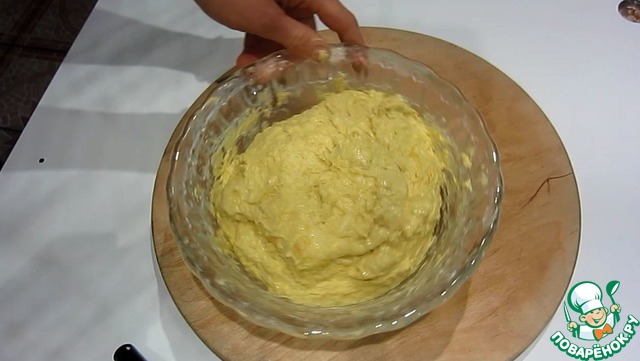 • Смазываем руки растительным маслом и замешиваем тесто. Убираем на 1 час в теплое место.