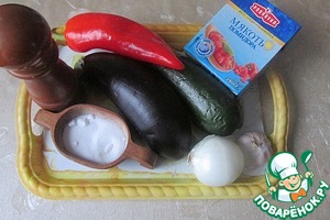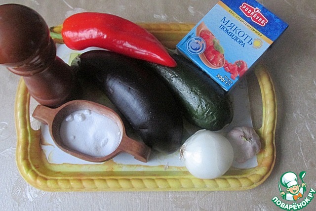 • Овощи чистим, с баклажана снимаем шкурку, нарезаем лук, перец, кабачок и баклажан кубиками, чеснок мелко рубим