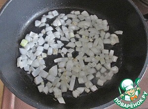 • В глубокий сотейник вливаем 1 столовую ложку растительного масла, нагреваем, высыпаем лук и жарим до мягкости