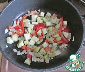 • Добавляем сладкий перец и кабачок, жарим, помешивая, 3 минуты