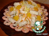 Вкусненький салатик с морепродуктами, овощами и необычным соусом. Интересная подача, к праздничному столу будет кстати.