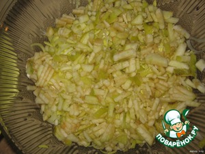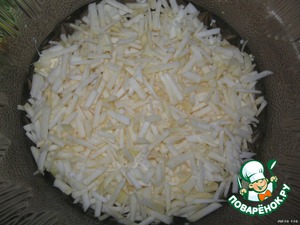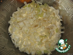 Следующий слой, корневой сельдерей, нарезанный соломкой. Немного посолить, поперчить. Майонез.