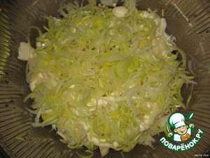 Следующим слоем выкладываем большую половину лука порея. Немного оставляем для украшения.