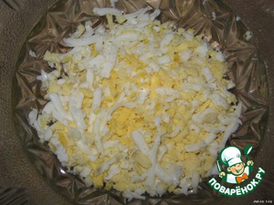 Отваренные яйца, натираем на крупной тёрке в глубокий салатник. Слегка посолить, поперчить и смазать майонезом. Салат делается слоями, но лучше именно в глубоком салатнике, потому что он очень сочный получается.