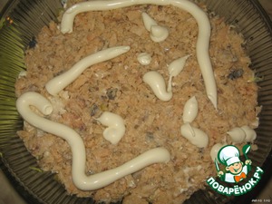 На апельсин выкладываем слой размятой горбуши (я использовала консервированную, но лучше взять отварную, а можно любую консервированную, только лучше без масла и, конечно же, не в томате). Майонез.