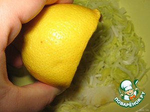 Лук порей нарезаем тоненькими полукольцами. Я использовала белую часть, от небольшого стебля, приблизительно 150 гр. Промываем его холодной водой (он не такой горький, как обычный репчатый, поэтому ошпаривать его не обязательно, достаточно холодной воды. А если использовать репчатый лук, то лучше его ошпарить, а потом промыть холодной водой), хорошо отжать от лишней воды и полить лимонным соком.
